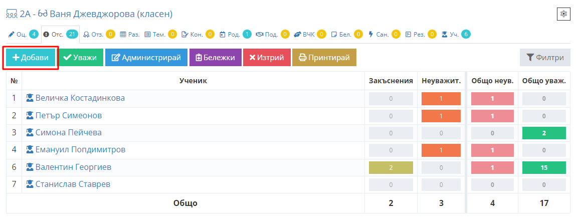 2. Изберете таб "Отсъствия" и кликнете бутон "Добави".