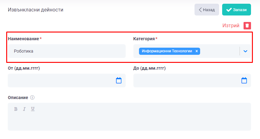 4. В раздел "Извънкласни дейности" се въвежда информация свързана с допълнителните дейности, в които сте участвали.