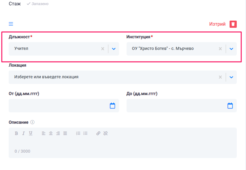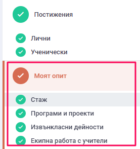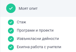 7. След като всички задължителни полета са попълнени и сме запазили, в навигационното меню ще се смени цвета на "Моят опит" в зелено.