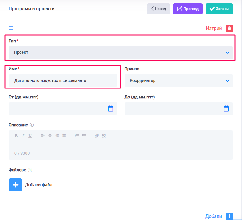 3.2. С помощта на бутон "Добави" можете да добавите още програми и проекти, в които сте участвали.