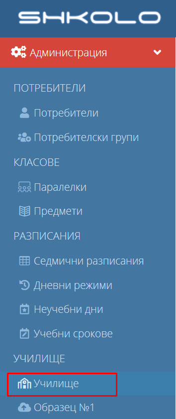 1. Навигирайте до модул "Администрация" и изберете "Училище".