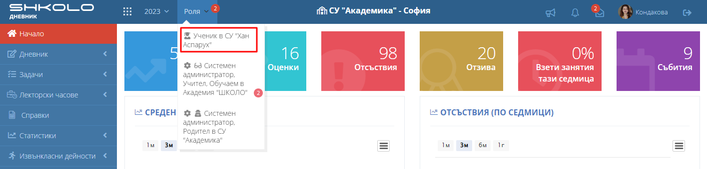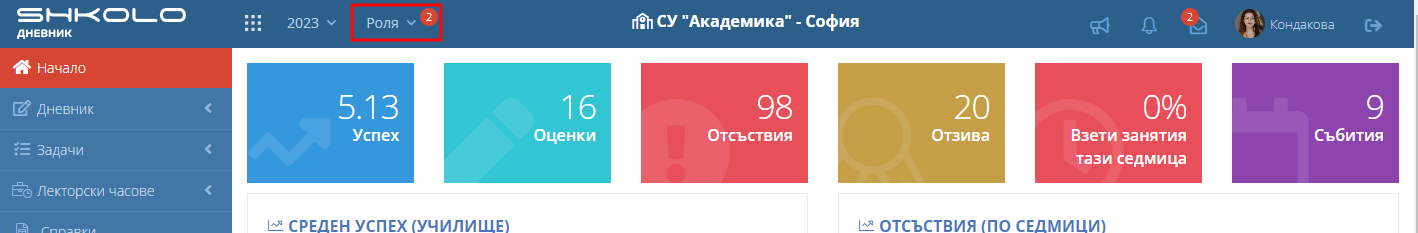 ВНИМАНИЕ: Бутонът за смяна на потребителски профил се показва само на потребители, които имат поне 2 профила в системата (обикновено това са родители, чиито деца учат в различни училища и те имат по един профил за всяко училище).