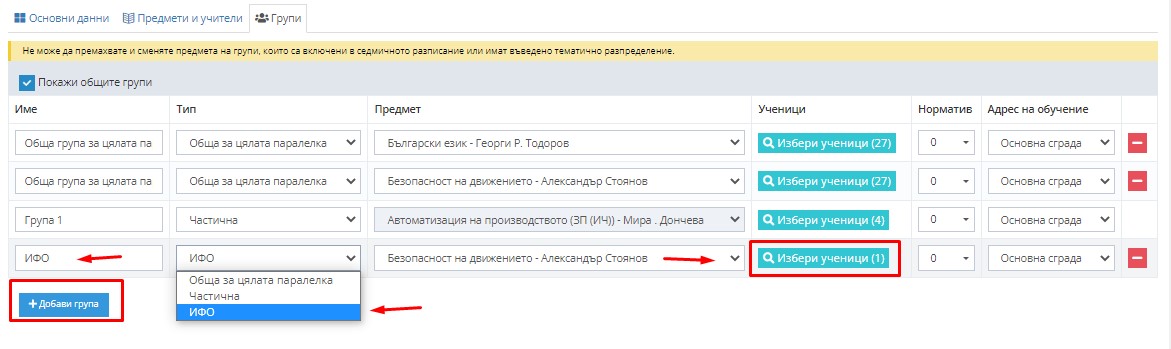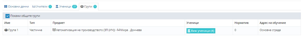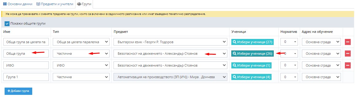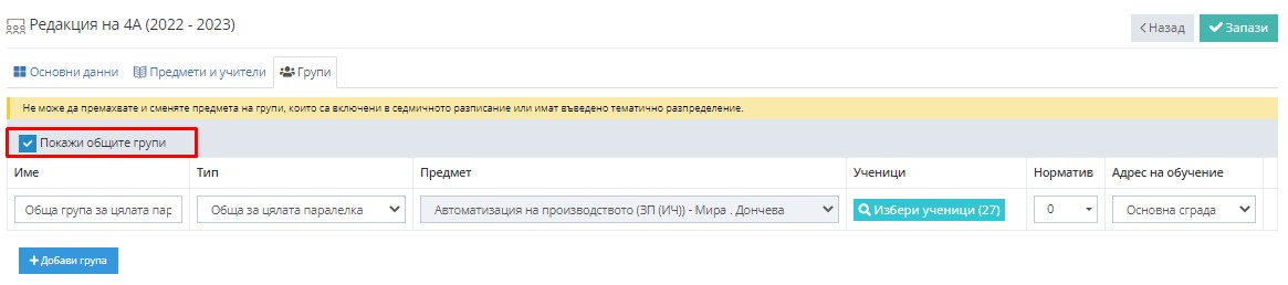 5.1. Коригриайте общата група по предмета, за който добавихте група в частична и редактирайте полетата.