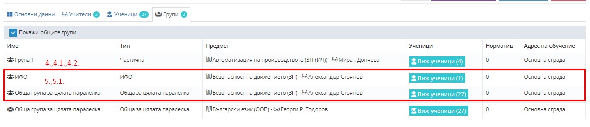 Вече имате редактирана обща група в частична (4.,4.1.,4.2.) и добавена нова група (5.,5.1.), с която сте разделили класа на две групи по даден предмет.