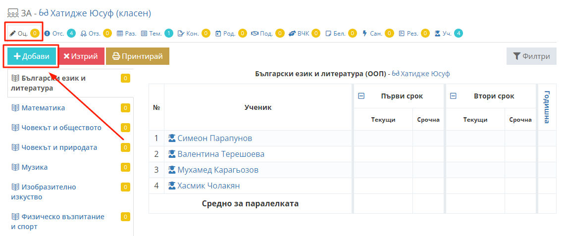 2. Изберете таб "Оценки" и кликнете бутон "Добави".