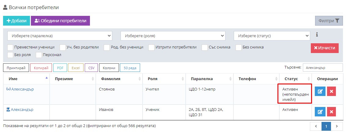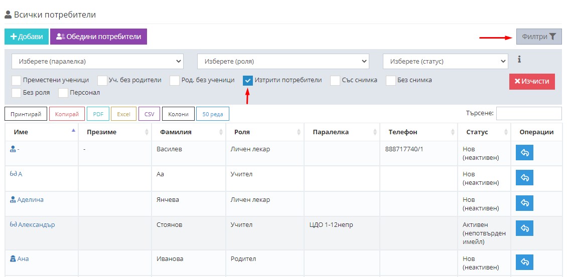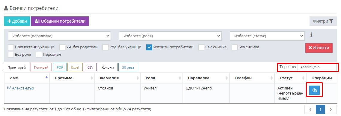 ВНИМАНИЕ: само училищният администратор има права да възстановява изтрити потребители.