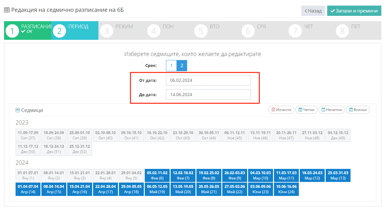 3. Може да избирате и конкретни седмици (или група от седмици), за които желаете да въведете седмично разписание.