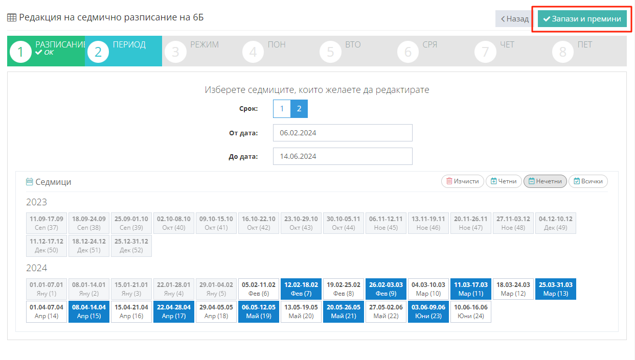 След като приключите с въвеждането на разписанието за ЧЕТНИ (НЕЧЕТНИ) седмици, не пропускайте да въведете по същия начин разписание и за останалия период!