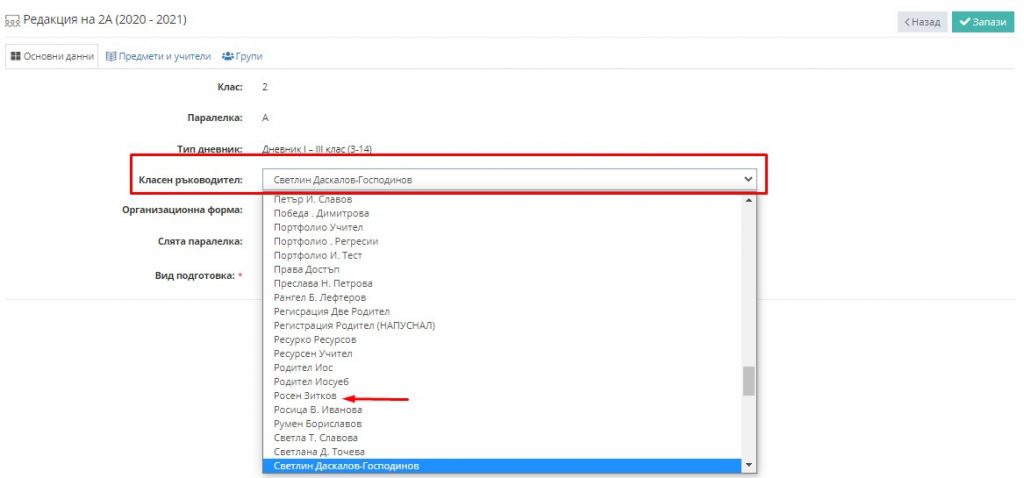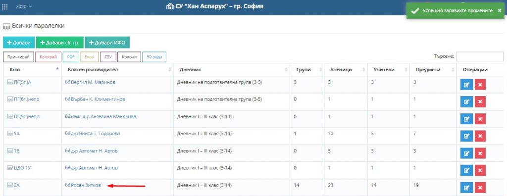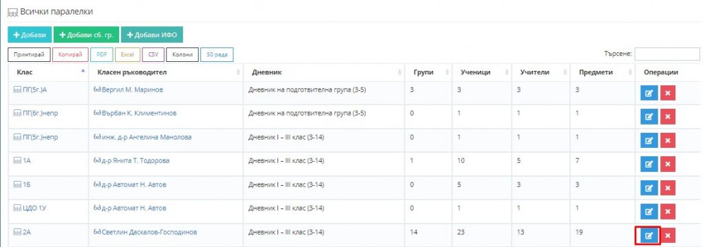 2. Изберете паралелка и кликнете бутон "Редактирай".