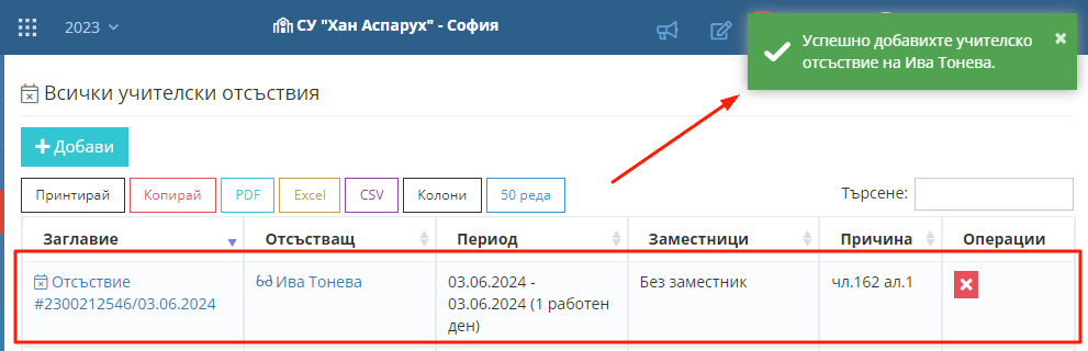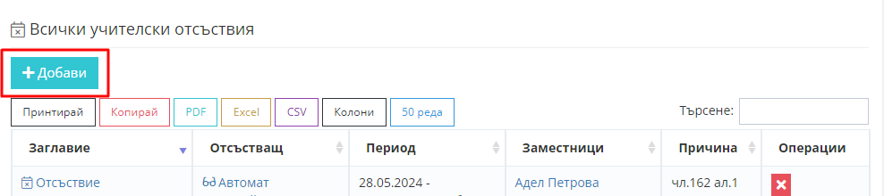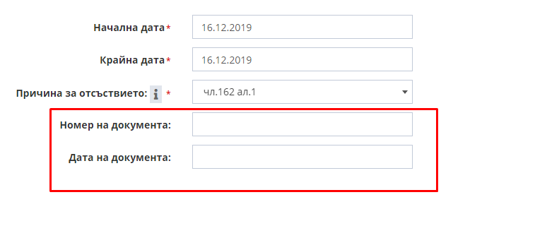 4.1 При създаване на учителско отсъствие, може да се посочат номер и дата на заповедта за отсъствие.