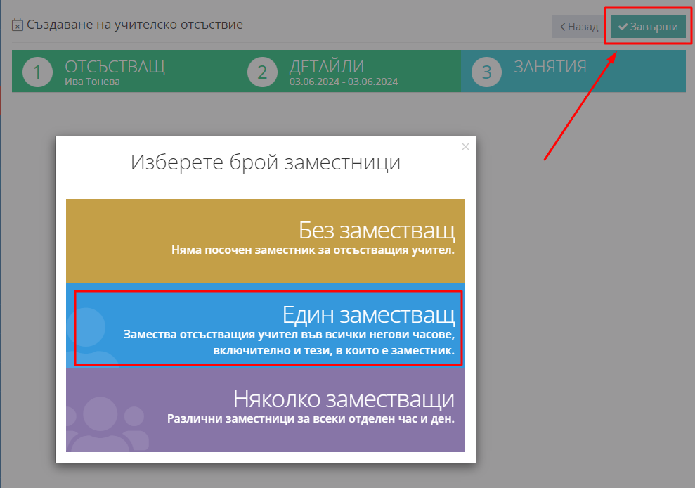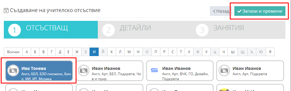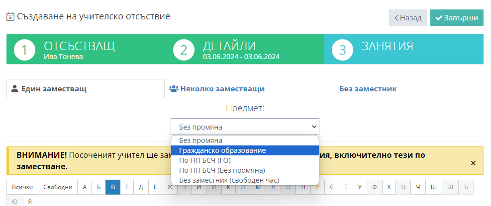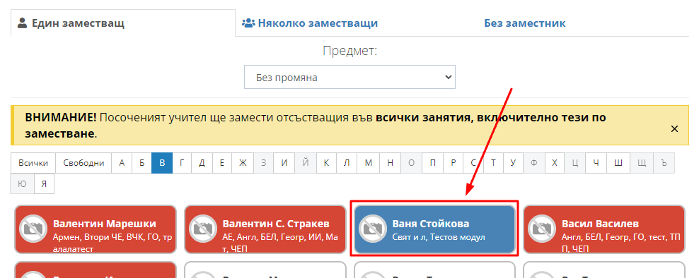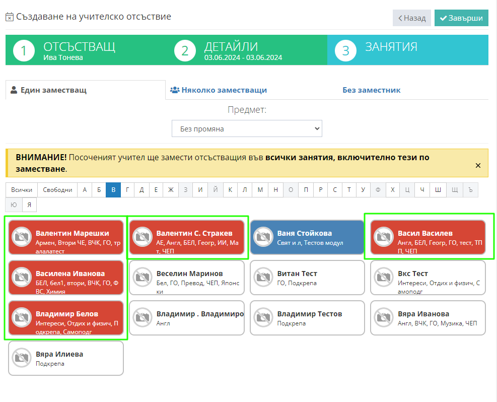 В случай, че заместващият е зает, дори за един от часовете, той ще излиза в червено, но това не пречи да го изберете.