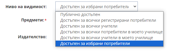 1. От падащот меню "Ниво на видимост" изберете, за кои потребители да бъде видим тестът.