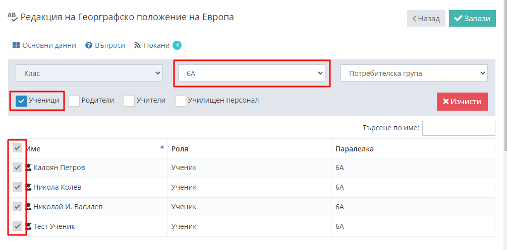 При създаване или редактиране на тест, можете да изберете кои потребители да имат достъп до него.