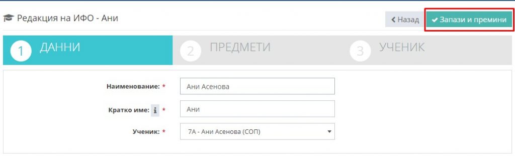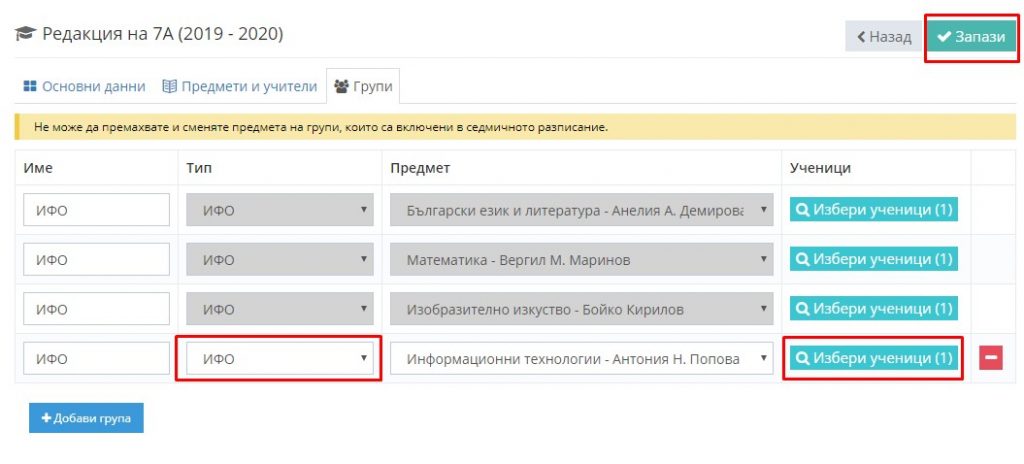 9. Не забравяйте да отбележите типа на групата като ИФО, както и да изберете съответния ученик.