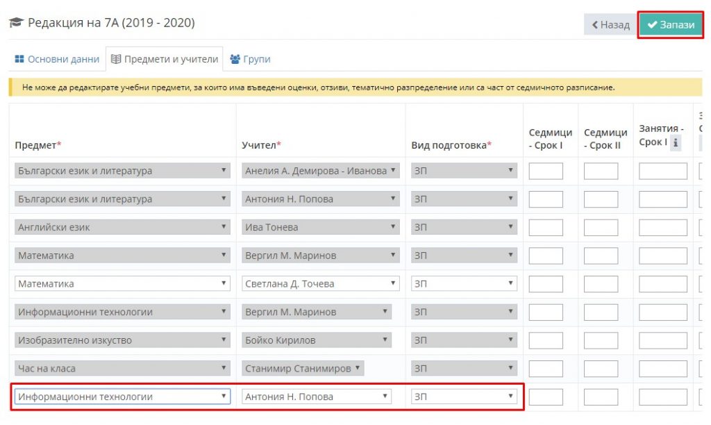 4. Изберете таб "Предмети и учители".
