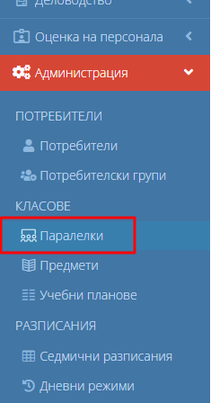 1. Навигирайте до модул "Администрация" и изберете "Паралелки".