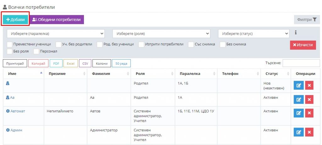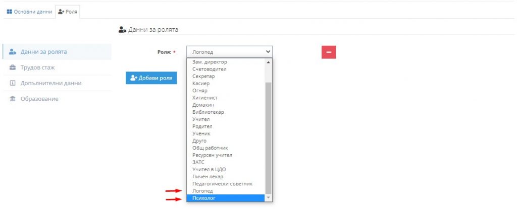 2. Кликнете бутон "Добави", ако психологът/логопедът все още нямат профил във Вашето училище.