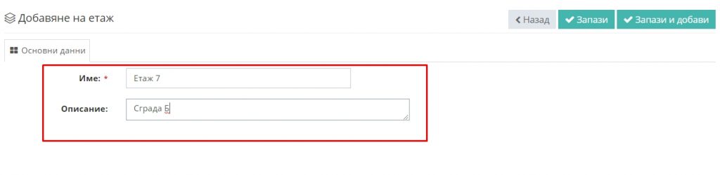 В раздел "Основни данни" системата автоматично задава поредността на етажът, който искате да добавите.