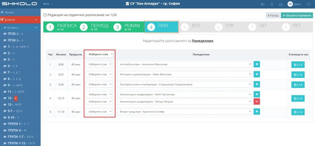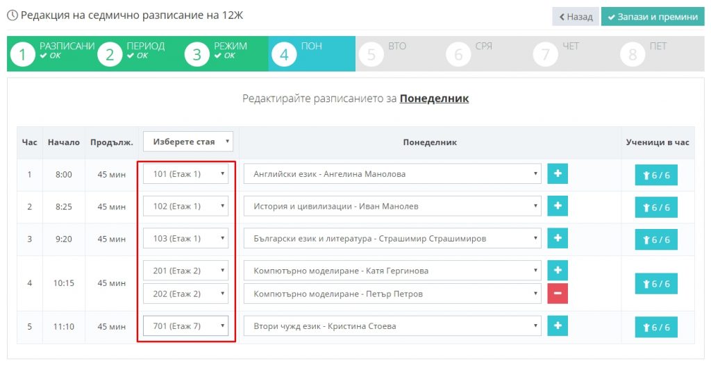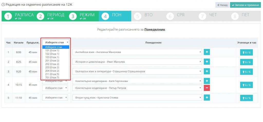 При въвеждане или редакцията на разписанието в конкретни дни, посочвайте помещенията от падащото меню “Изберете стая”.