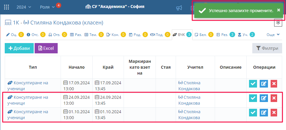 4. Вече виждаме новите часове в таблицата