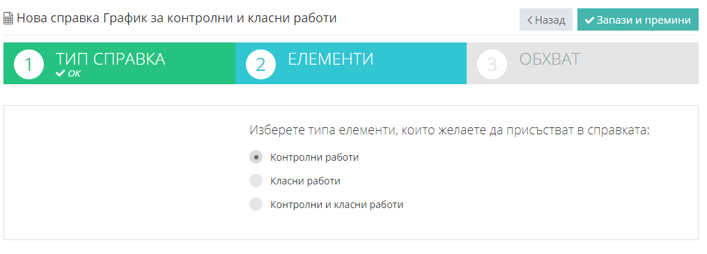 4. Изберете типа елементи, които желаете да включите в справката и натиснете "Запази и премини".
