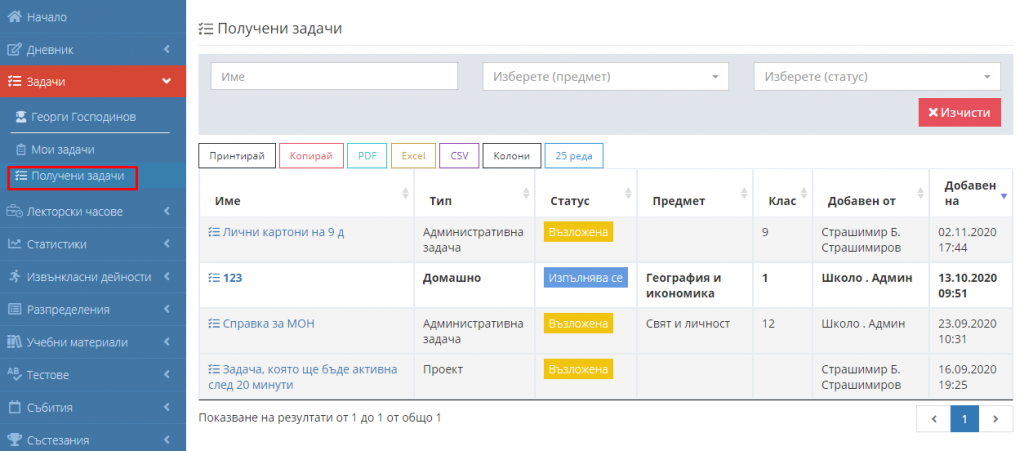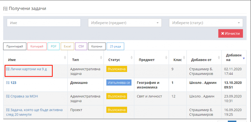 1. Навигирайте до модул "Задачи" и изберете "Получени задачи".
