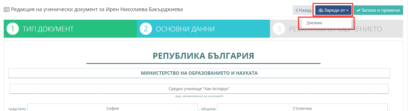 В случай че добавяте или редактирате вече създаден документ, имайте предвид, че при избор на бутон "Заради от дневник", всички ръчно въведени досега данни ще се заменят с тези, които се съдържат в дневника. Това правило важи страница по страница.