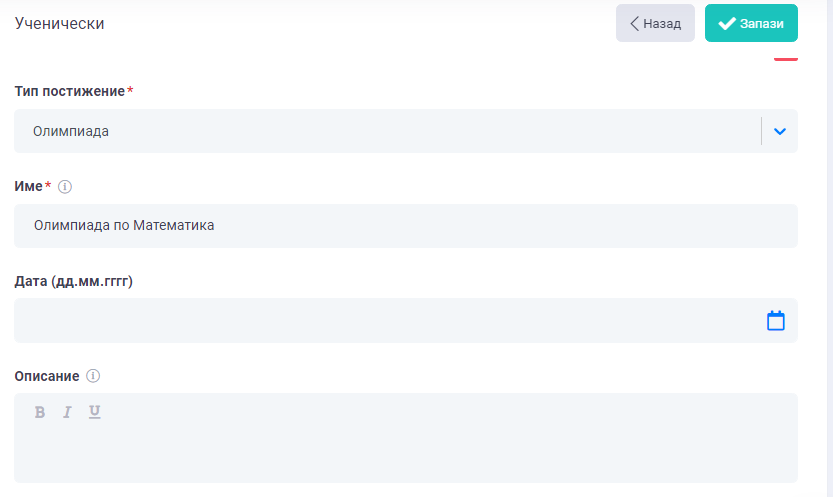 3. В раздел "Ученически постижения", въведете информация за постиженията на Вашите ученици - олимпиади и състезания.