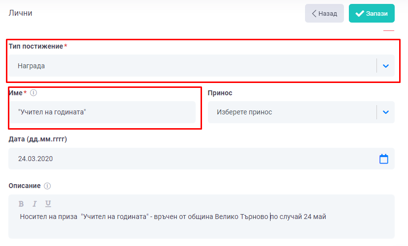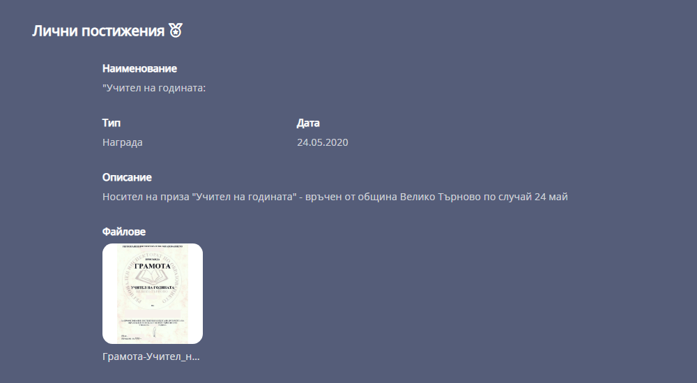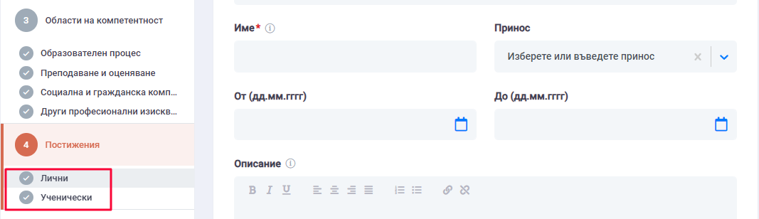 2. В раздел "Лични постижения" въведете информация за Вашите лични успехи - награди, сертификати, грамоти и т.н.