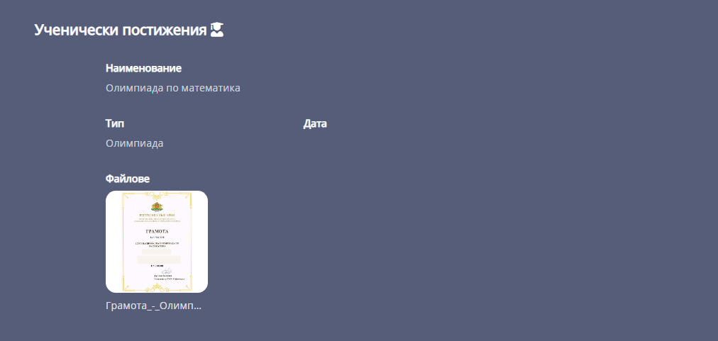1. Навигирайте до секция "Постижения" където се попълват данни за лични и ученически постижения.