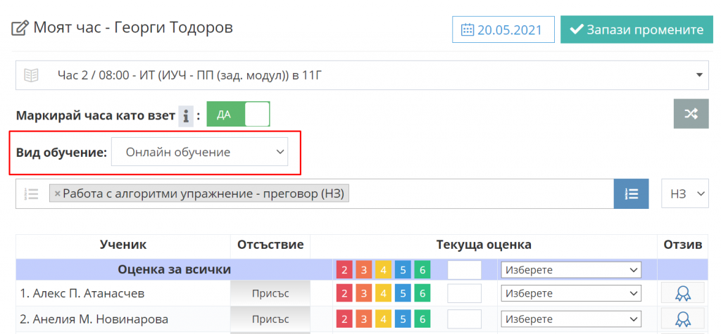 2. В полето "Вид обучение" изберете "Онлайн обучение", въведете нужните атрибути за часа и кликнете на бутон "Запази промените".