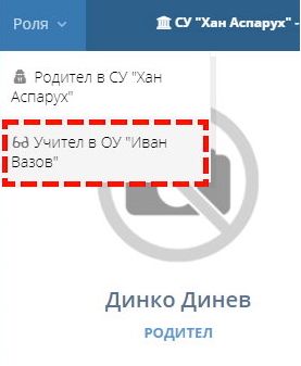 При съвпадане на телефонния номер на потребител, който има роля в друго училище, профилите ще се свържат. Няма да има нужда от нова регистрация и учителят ще продължи да влиза в системата със същите данни. За да превключва между училищата е достатъчно да посочи кое училище иска да бъде изведено на екрана от бутон "Роля".