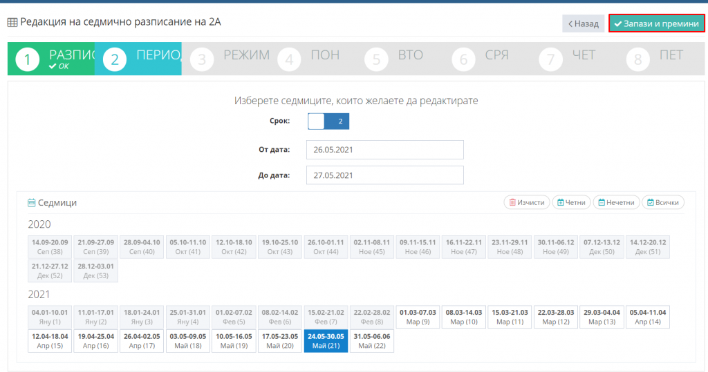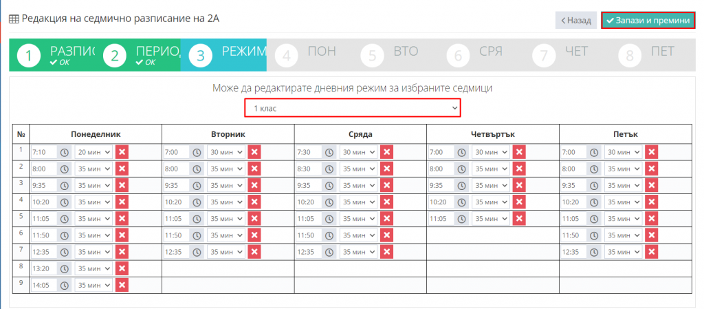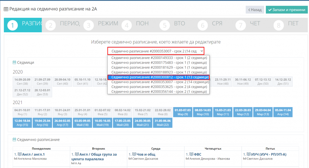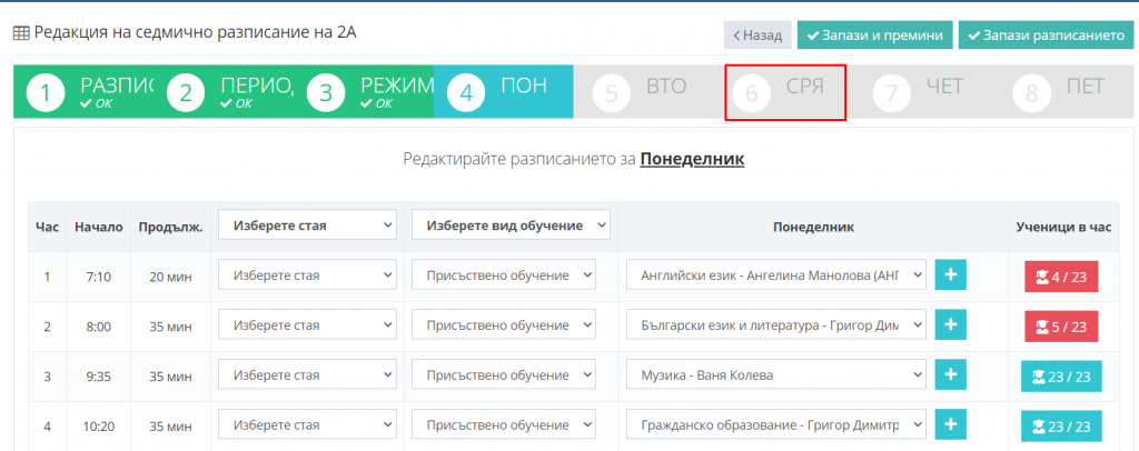 5. Кликнете бутон "Запази и премини" и продължете с редакцията на седмичното разписание.