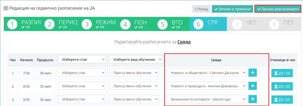 8. Въведете нужните промени и кликнете бутон "Запази разписанието".