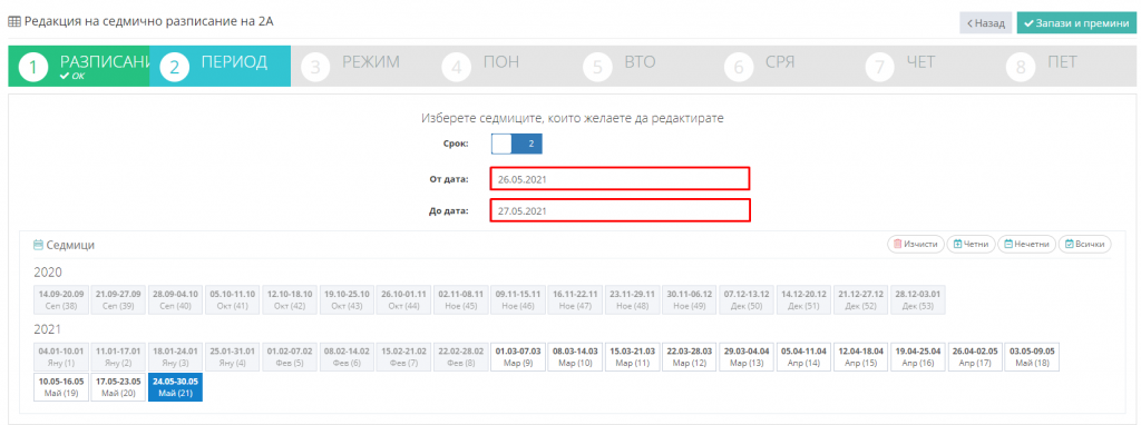 4. Изберете период, за който желаете да редактирате разписанието.