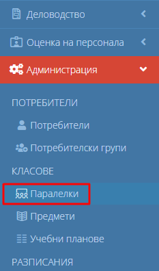 1. Навигирайте до модул "Администрация" изберете "Паралелки".