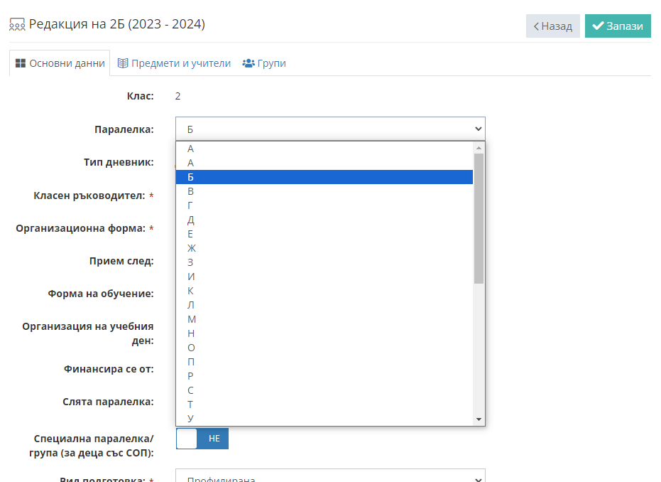 3. От полето срещу "Паралелка" изберете новото име.