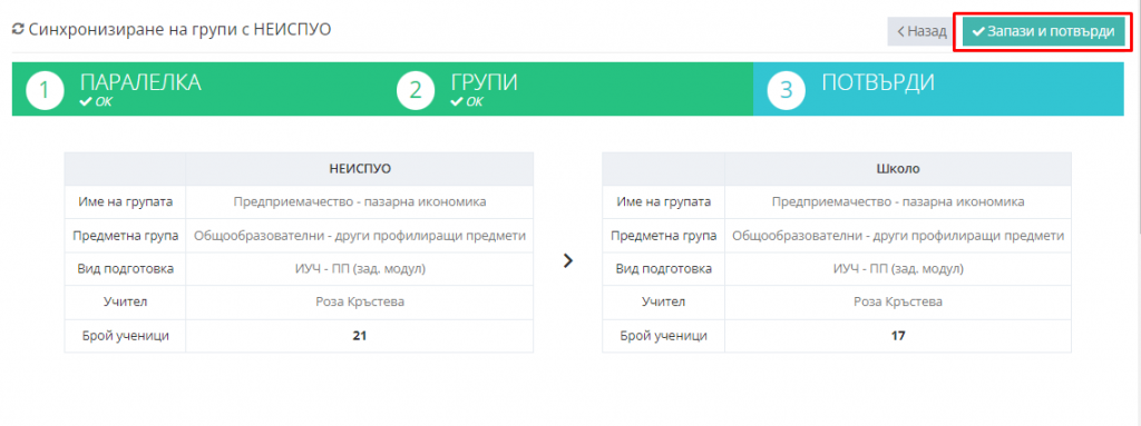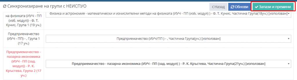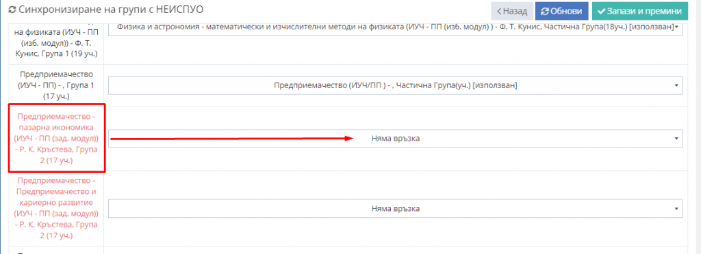 4. За всяка група от Школо изберете с коя група от НЕИСПУО трябва да бъде синрхонизирана.