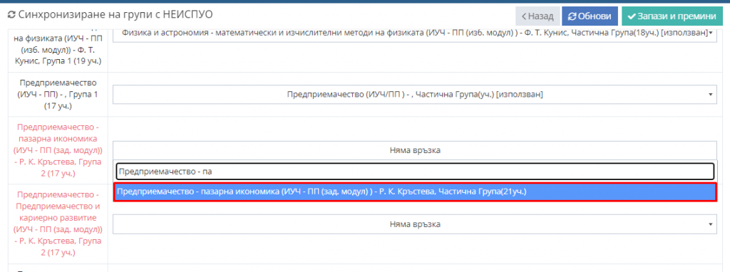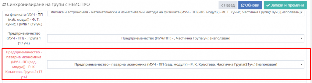 4.2. Изберете с коя група от Неиспуо желаете да направите сихронизация, като внимавате името на предмета и вида подготовка да са едни и същи.
