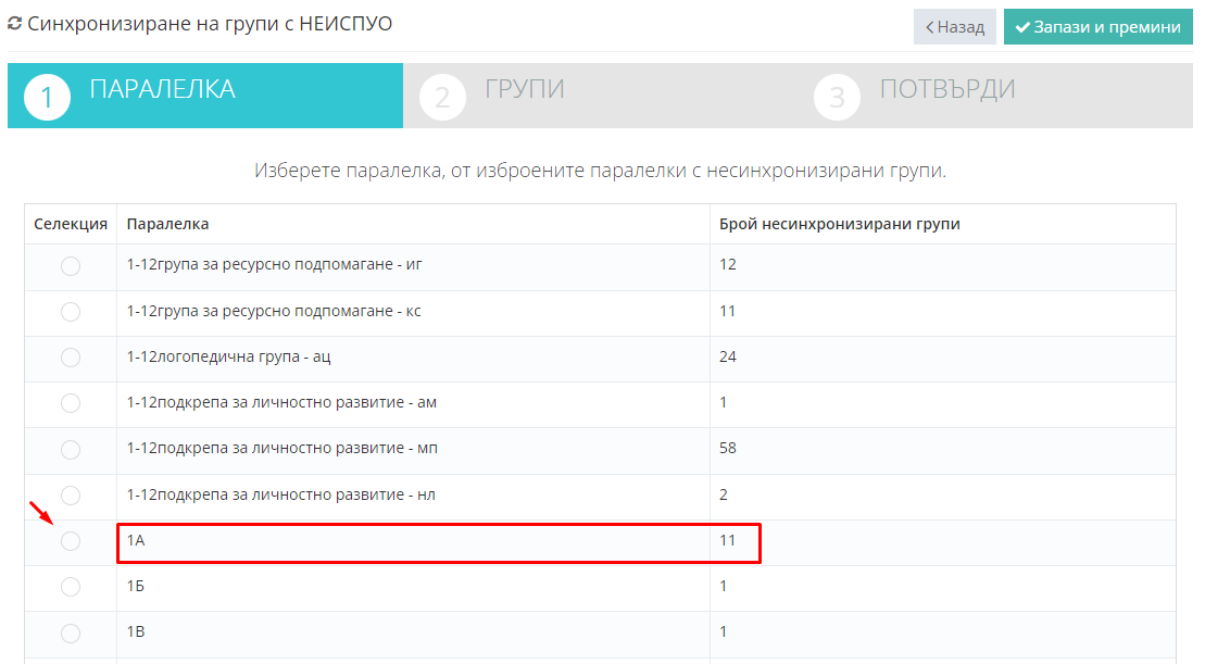 3. Изберете паралелка, от изброените паралелки с несинхронизирани групи. Кликнете бутон "Запази и премини".