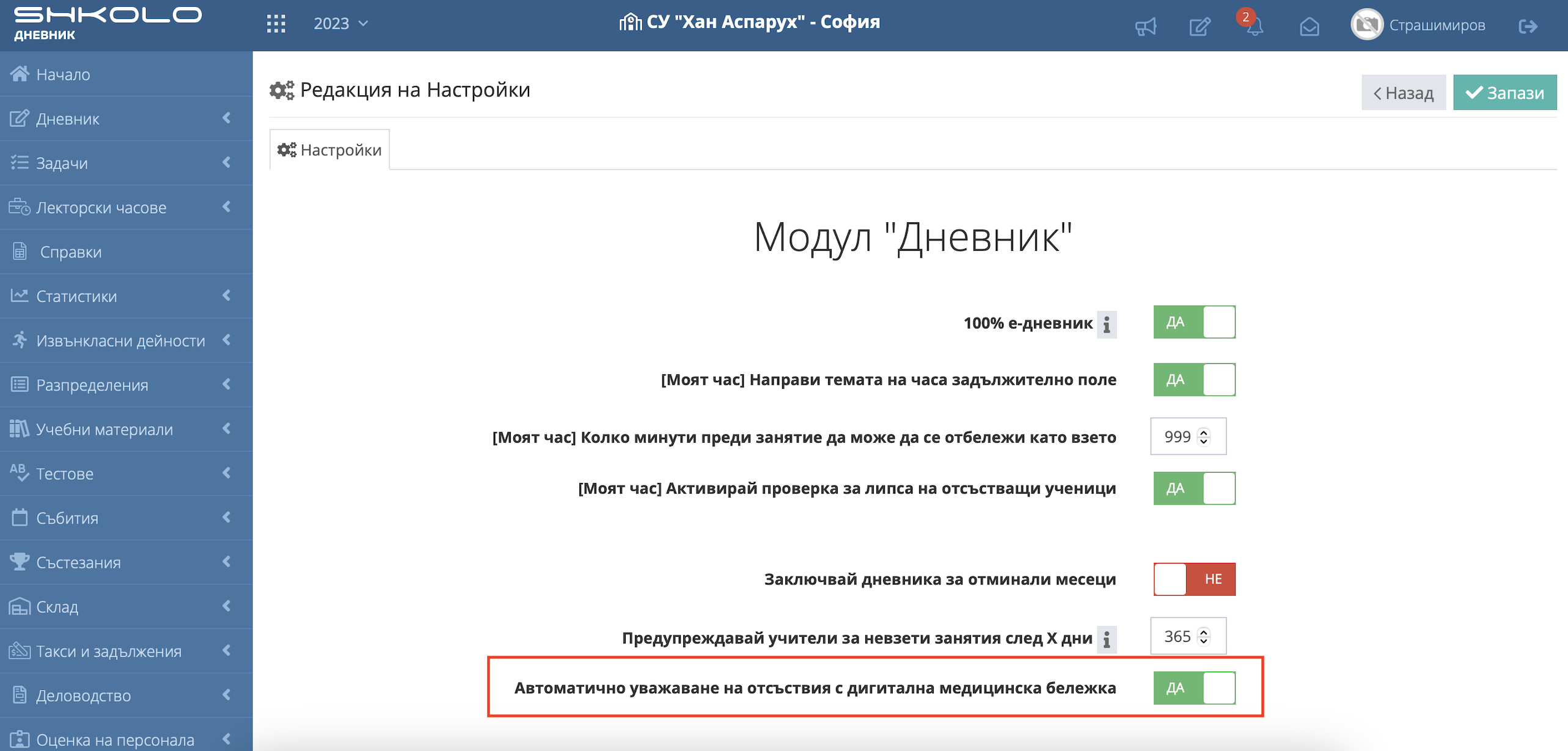3. Активирате "Автоматично уважаване на отсъствия с дигитална медицинска бележка".