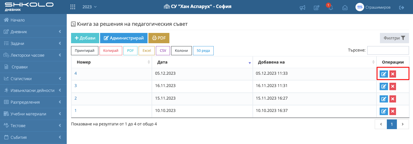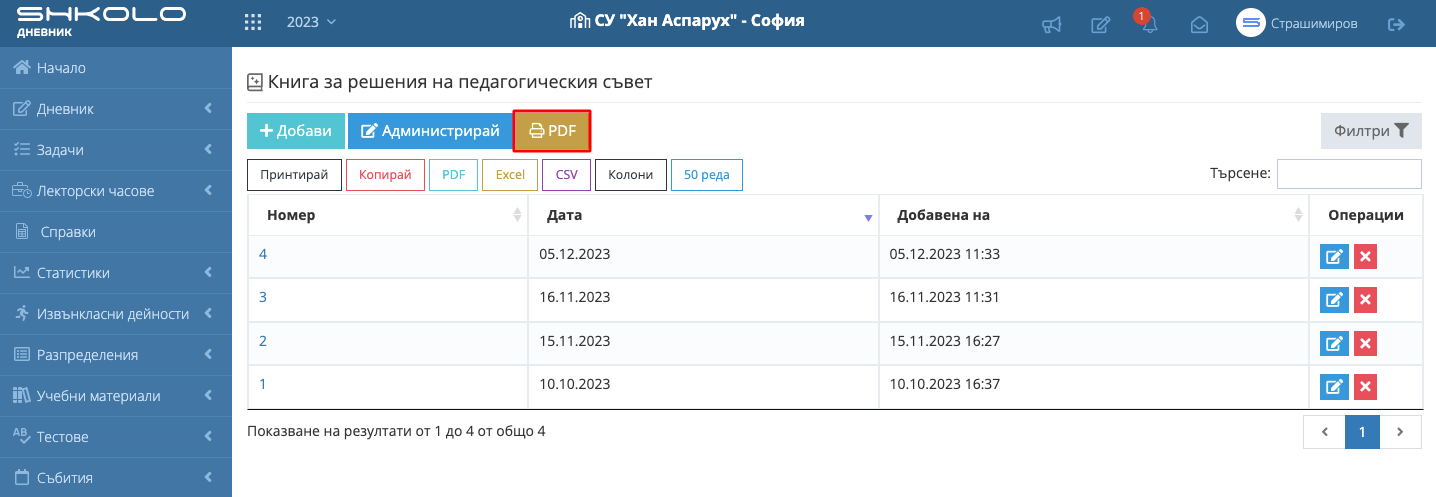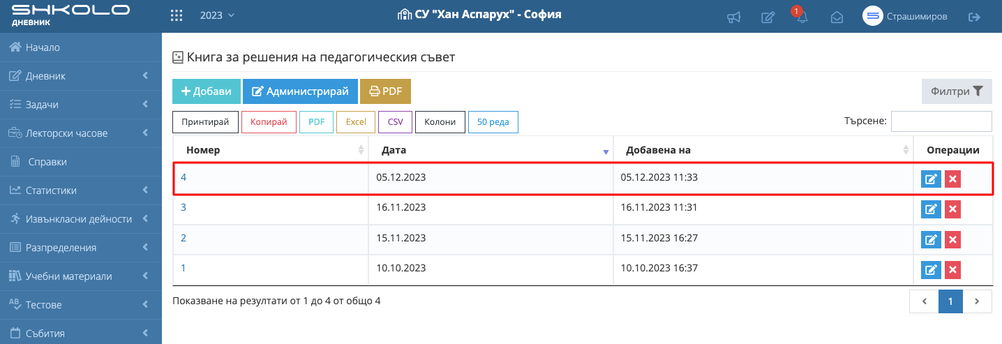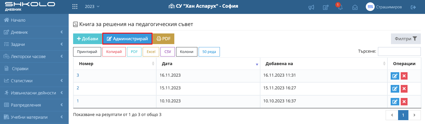 Директор, заместник-директор, системен администратор имат право да администрират книгата (да въведат секретар и членове на педагогическия съвет).