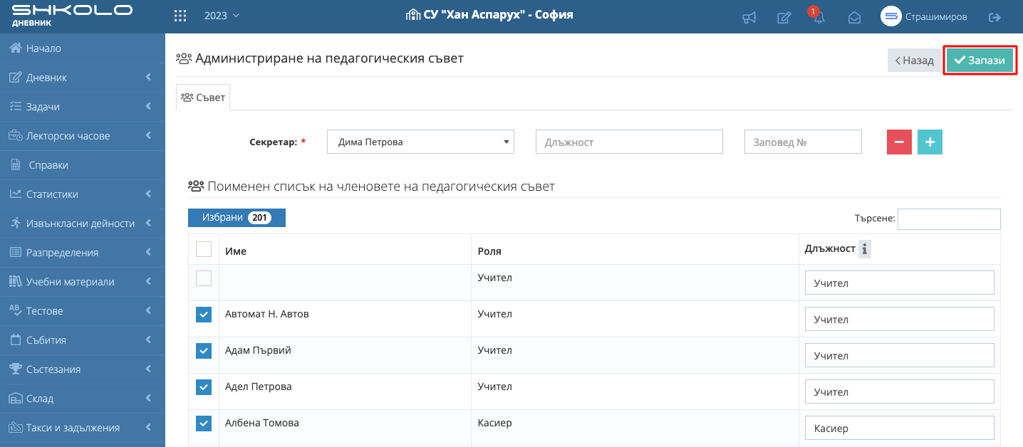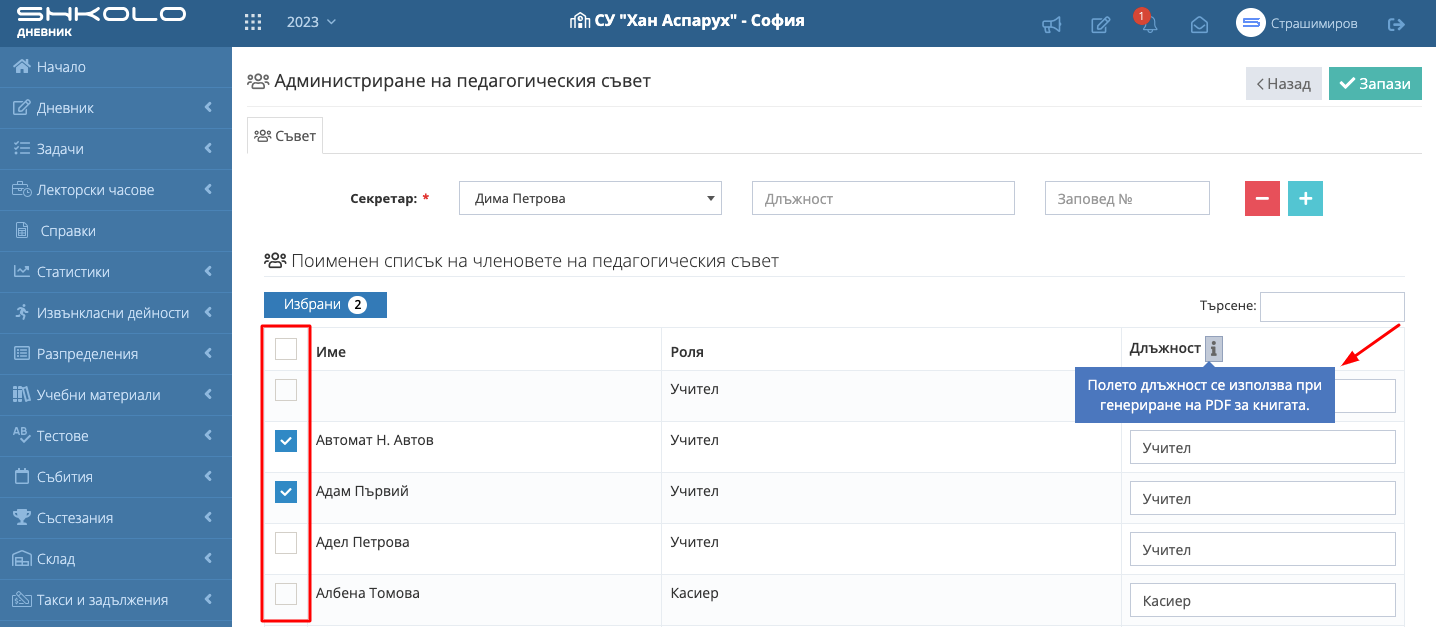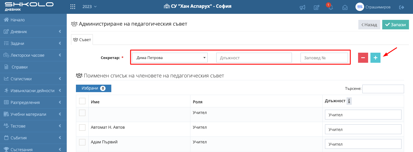 4. Изберете "Членовете на педагогическия съвет" и въведете "Длъжност". По подразбиране в полето длъжност зареждаме ролята на потребителя в Школо.