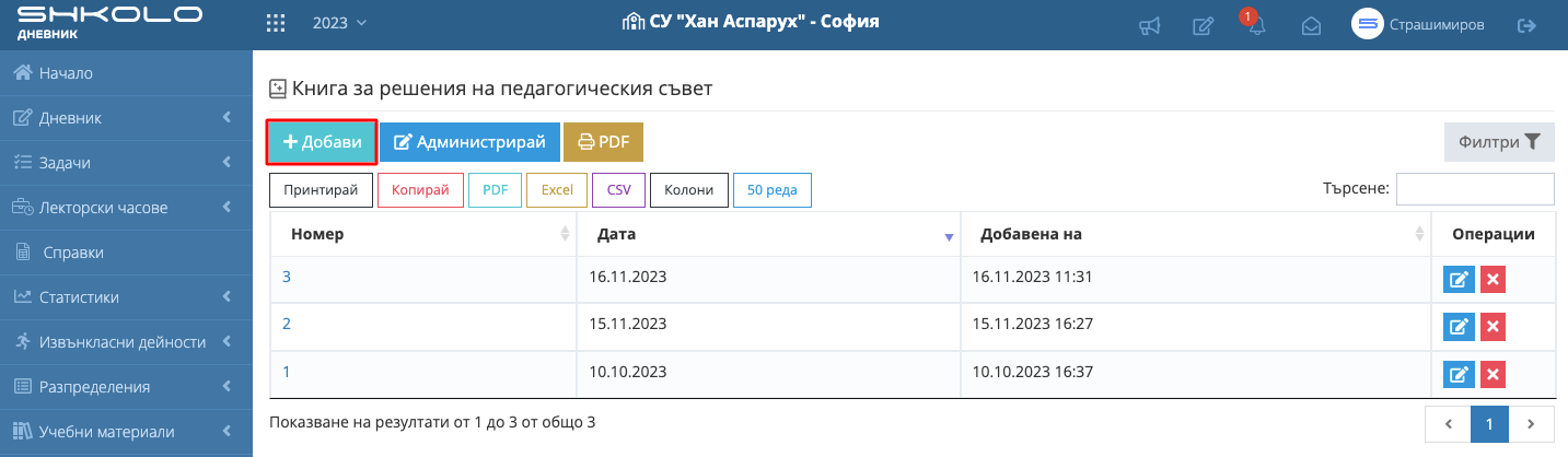 1. Навигирайте до модул "Деловодсво" и изберете "Книга за решения на педагогическия съвет".