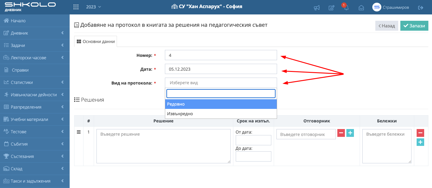 7. Въведете "Номер", "Дата" и "Вид на протокола".