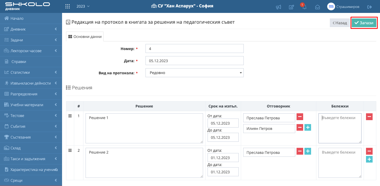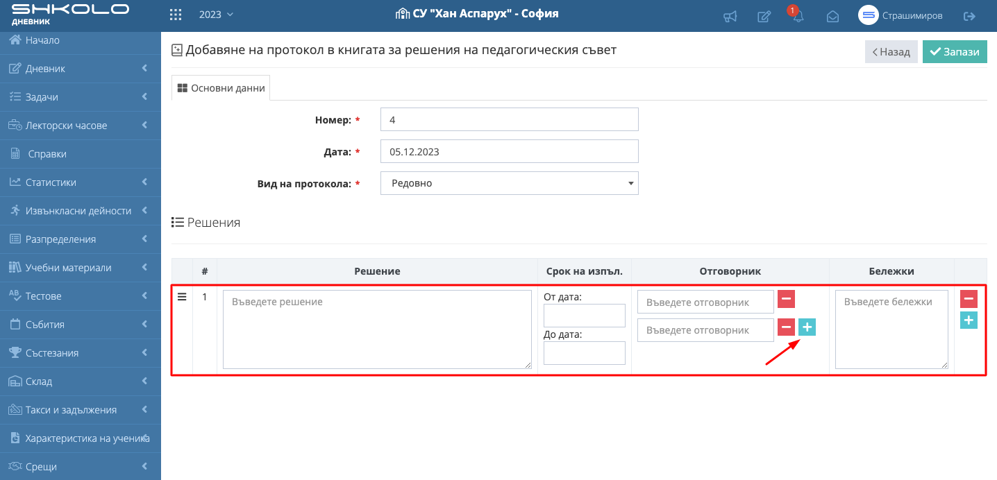 8. Въведете данните за взето решение. Има възможност да добавяте повече от един "Отговорник".