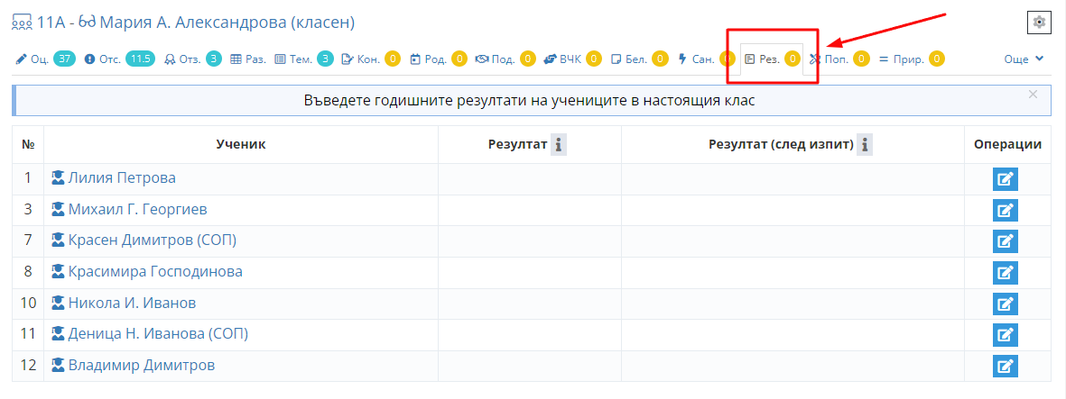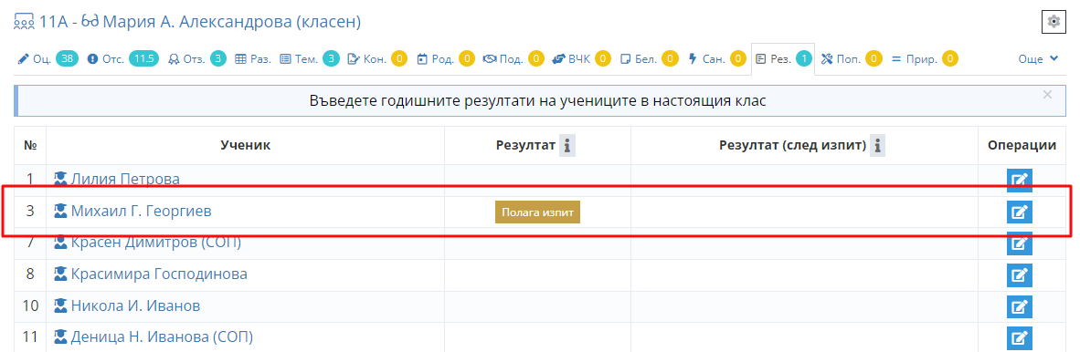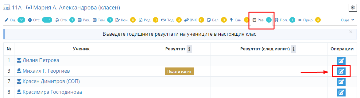 3. Кликнете на иконката за редакция, срещу името на ученика, на когото трябва да въведете поправителен изпит.