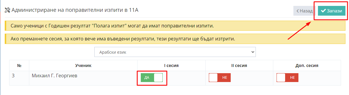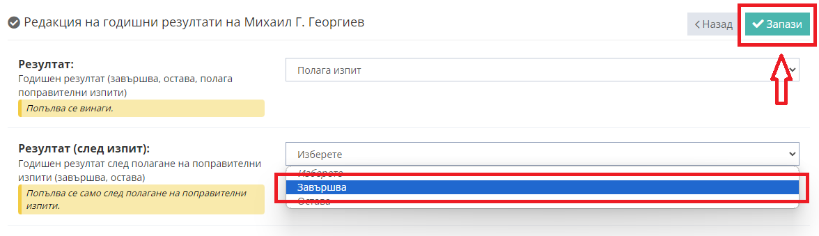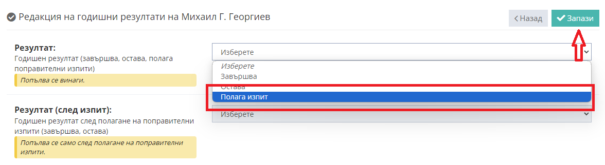 4. От първото падащо меню изберете "Полагата изпит", след което кликнете бутон "Запази".