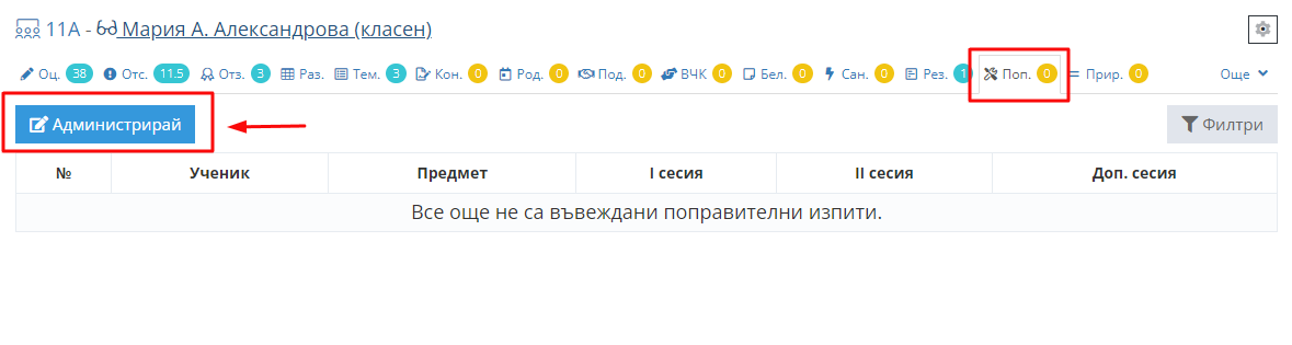 5. След това изберете секция "Поправителни изпити" (Поп.) и кликнете бутон "Администрирай".