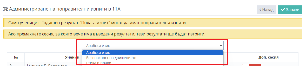 6. От падащото меню изберете предмета, по който ученикът трябва да положи поправителен изпит.